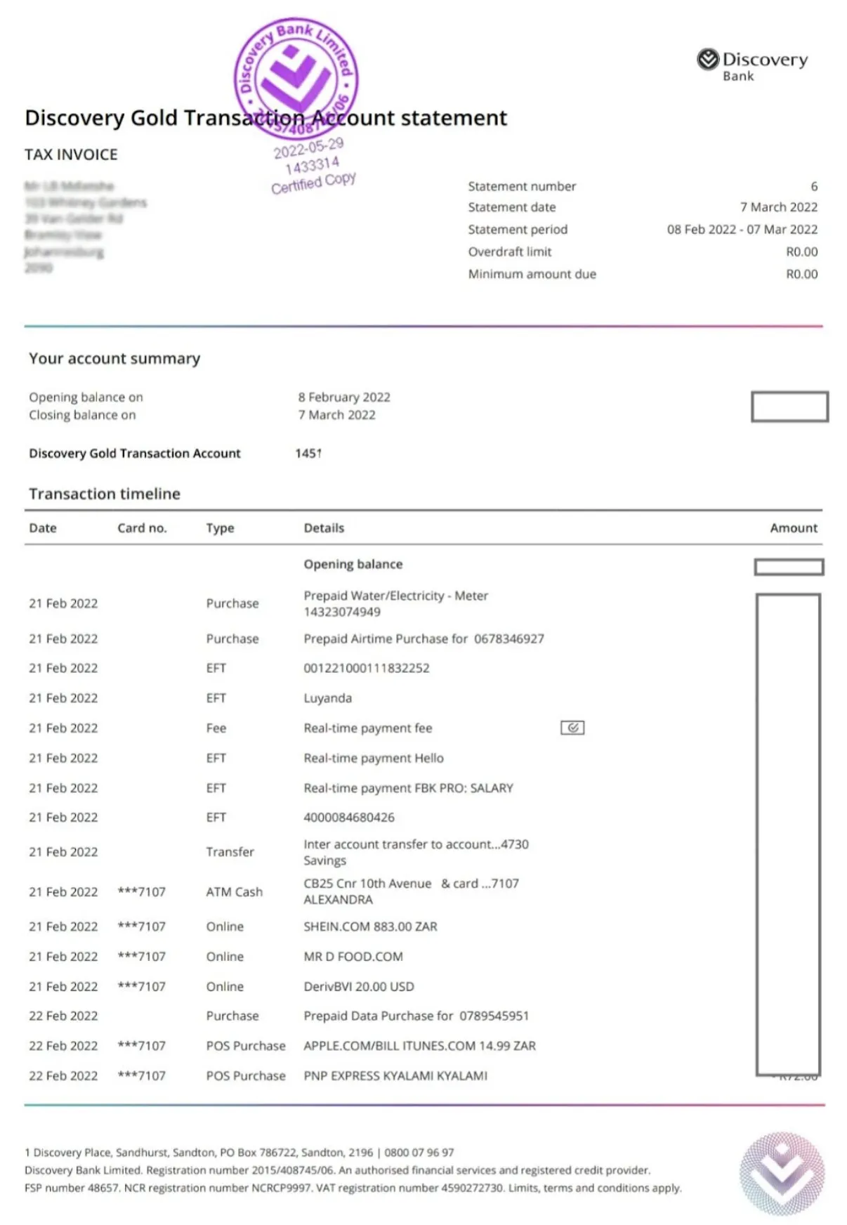 Bank statements include the account holder 's name, address, account number, and bank branch details . It also contains a summary table showing the timeframe of the statement, opening and closing bank balance, any deposits made into the account, refunds, and any cash withdrawals.